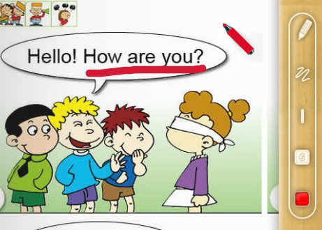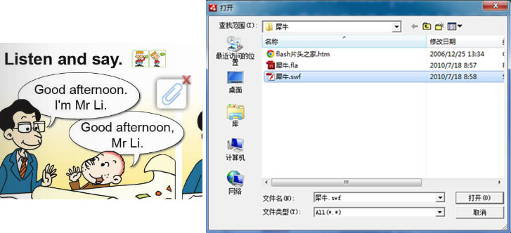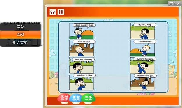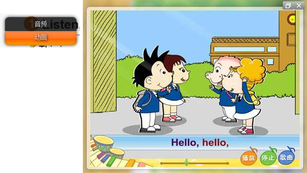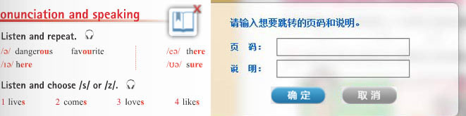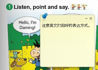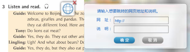 ”,会出现音频、动画、听力文本等多项活动的下拉菜单。点读 鼠标点击覆盖浅蓝色热区的语句,可实现即点即播。